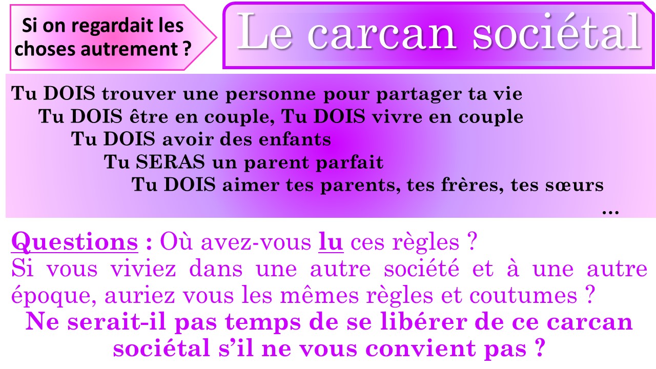 Séances médiumniques et énergétiques Le carcan sociétal 20 avril 202220 avril 2022 Les règles/coutumes de la société …que l’on peut appeler le carcan sociétal qui enferme dans une vie qui n’est pas la sienne !!! la liberté de choisir SA vie