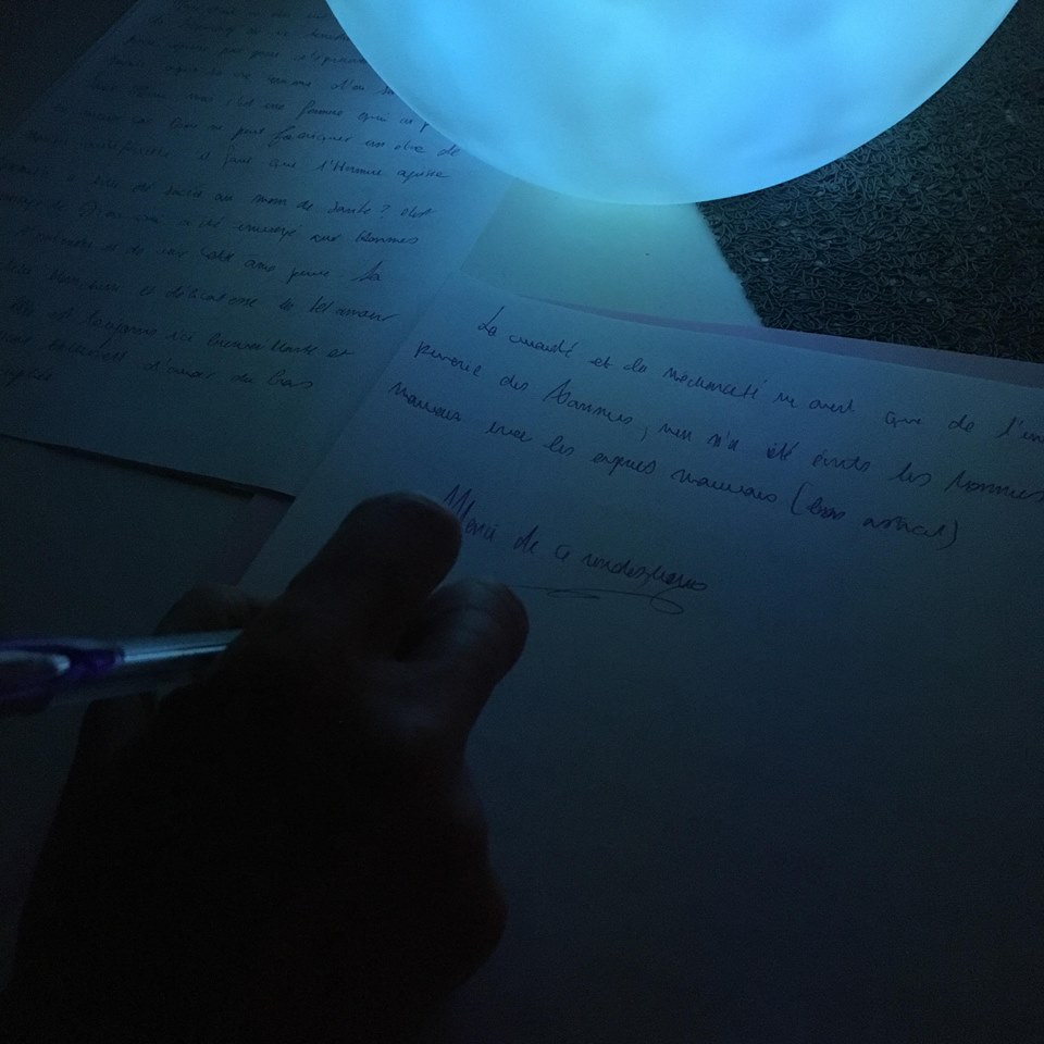 Je tente de rentrer en contact avec le défunt par écriture « médiumnique » : contrairement à l’écriture automatique où le stylo écrit « seul », j’entends ce qui va s’écrire.